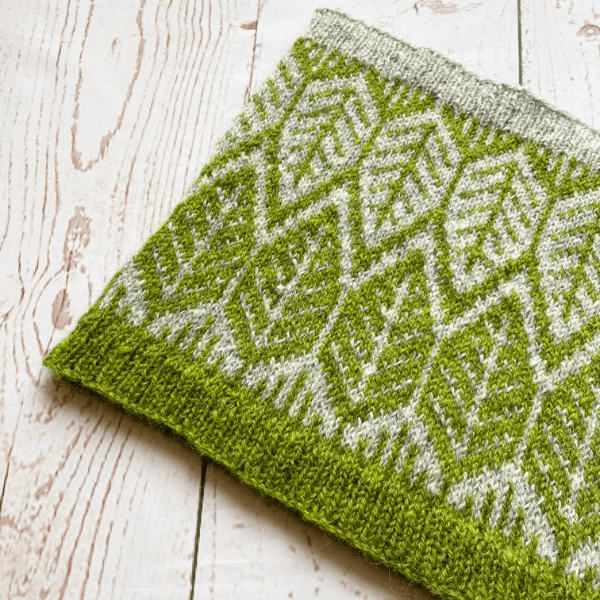 This cowl is knit in one piece in the round with four different circumferences options. Stranded colourwork sections are charted only.
