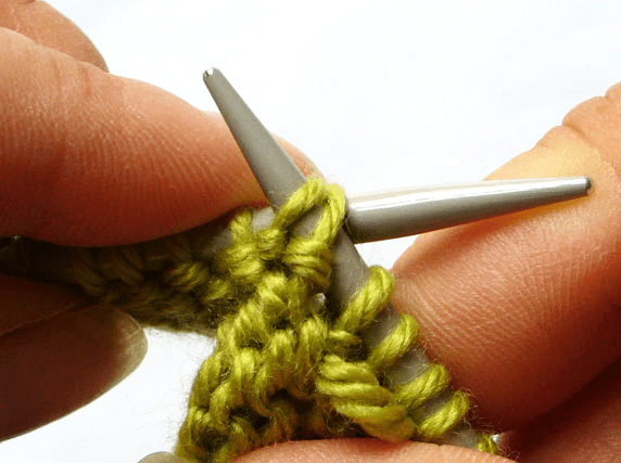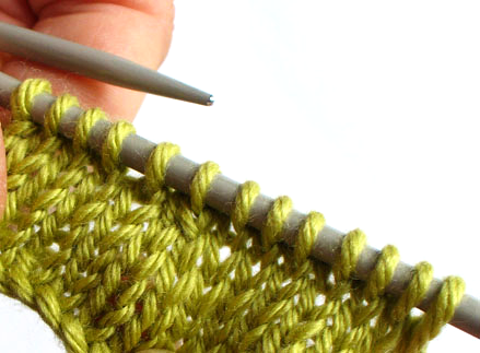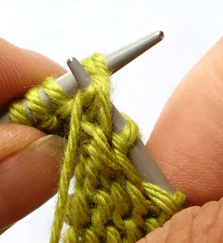 Step 2: bring the left needle up and under these two stitches and slide them back on to the left needle: